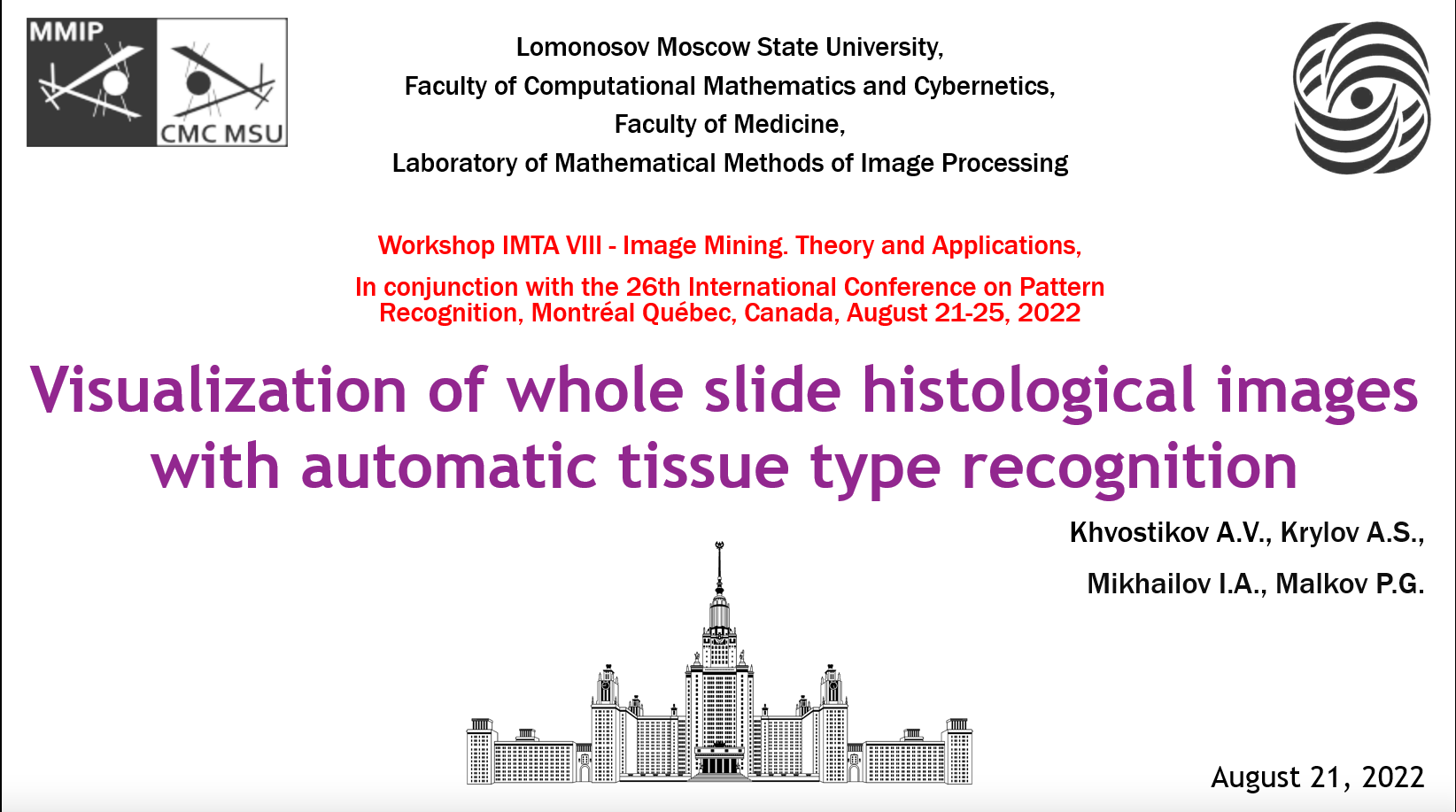 Alexander Khvostikov, Andrey Krylov, Ilya Mikhailov and Pavel Malkov “Visualization of whole slide histological images with automatic tissue type recognition” (Lomonosov Moscow State University, Moscow, the Russian Federation).